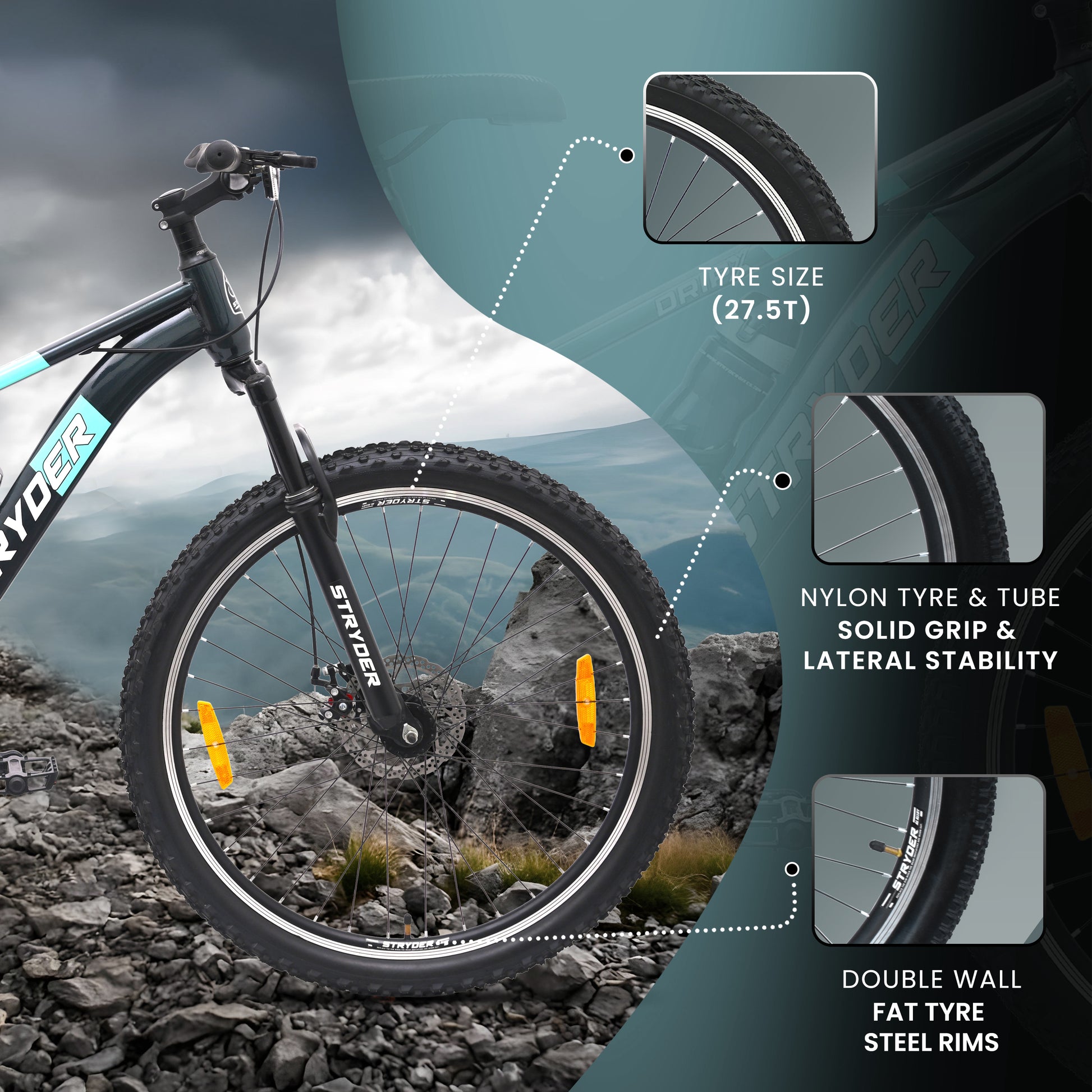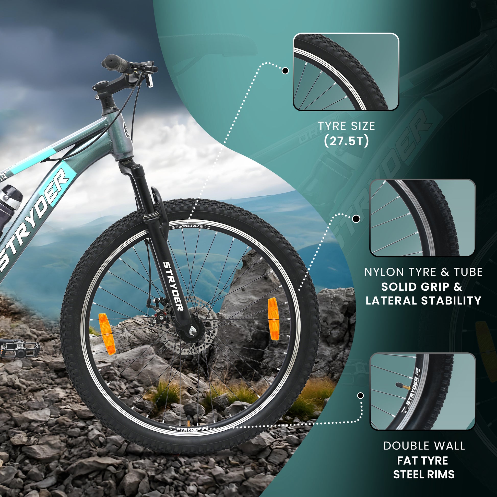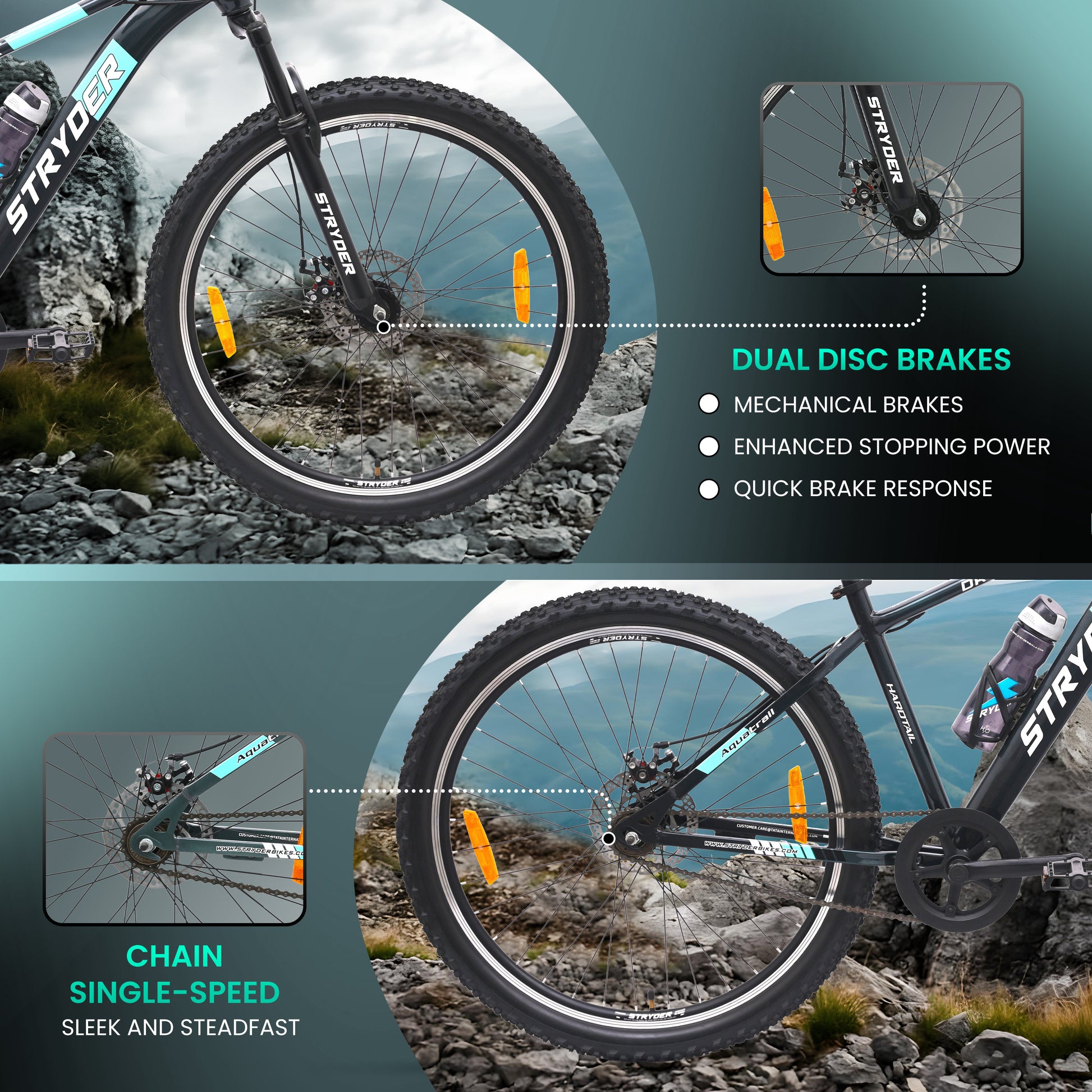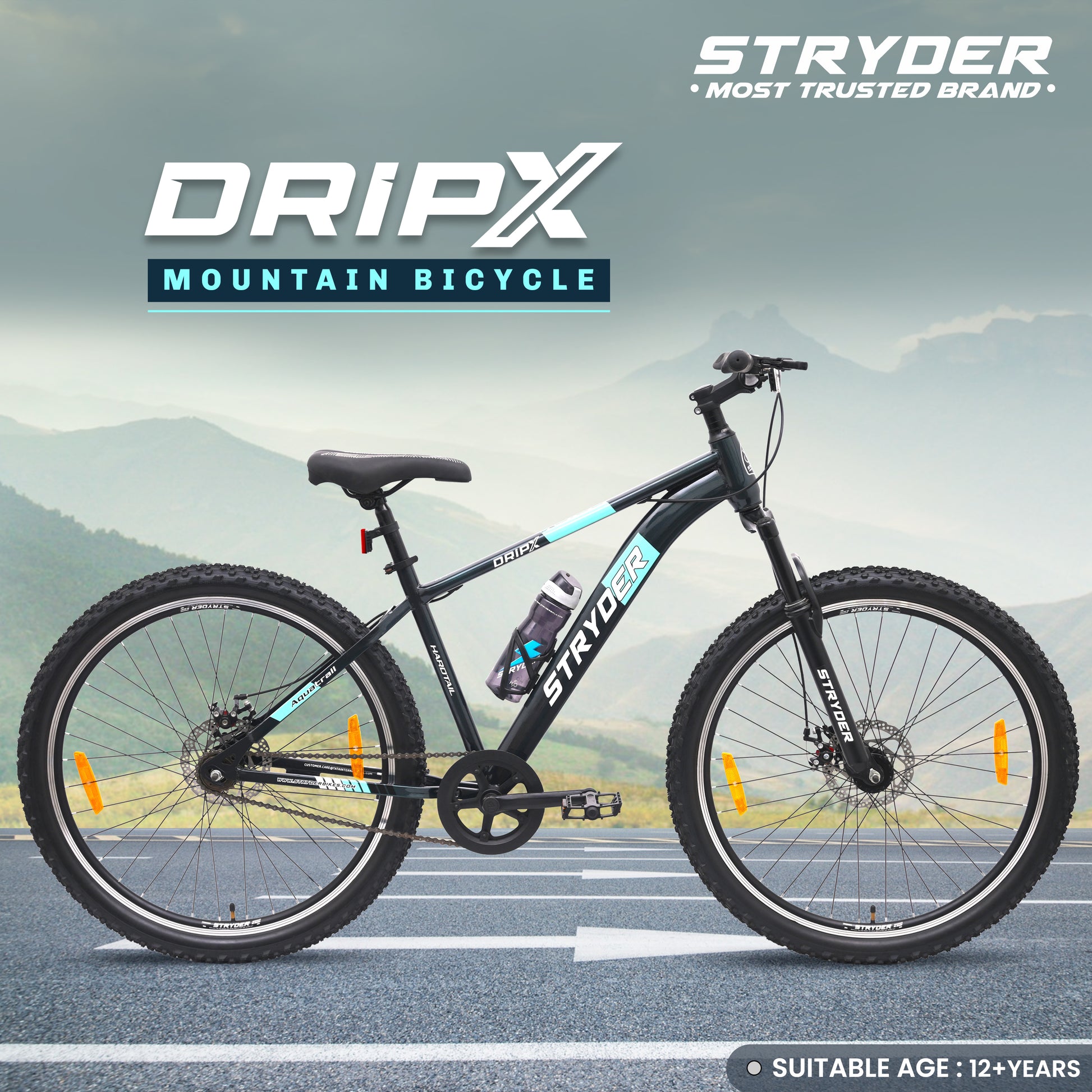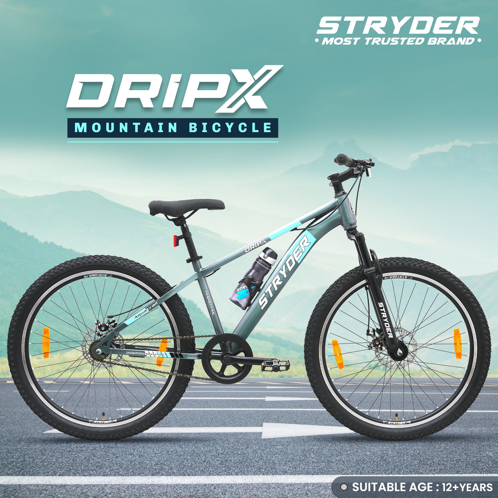27T DRIP-X MTB frame design with water decals, available in three colours (including a grey-to-green colour-shift). Features dual disc brakes, wide double-wall rims, alloy pedals, and matching decals for each frame.